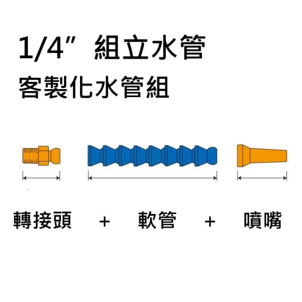 可作為金屬加工機的切削液軟管、其他種類液體、空氣用軟管等,並能依照組合配件的不同自由更換角度、長度與口徑。